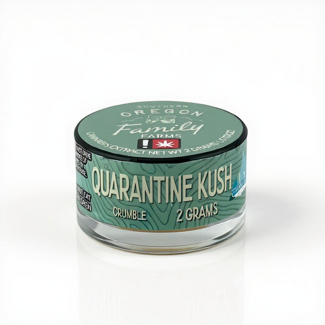 Quarantine Kush by Southern Oregon Family Farms is a potent and flavorful cannabis concentrate packaged in a 2g bucket. With 88.72% THC, this crumble delivers bold flavor and curated potency for connoisseurs.